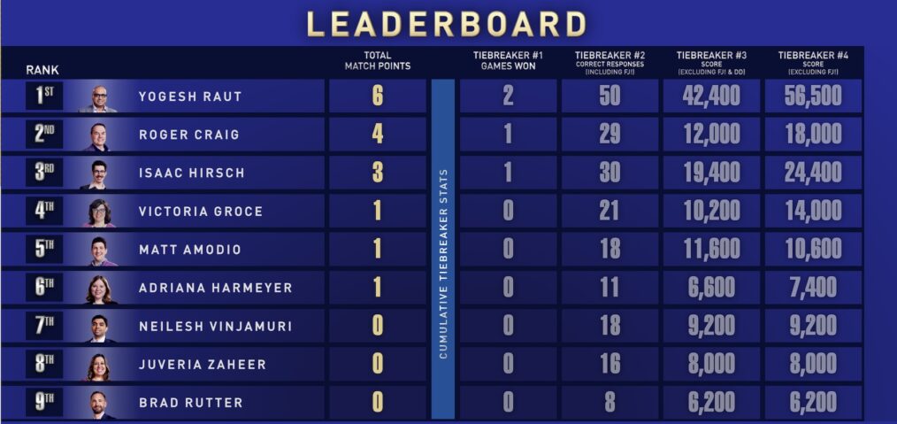 Vinjamuri, Juveria Zaheer, and Brad Rutter currently have 0 points and are in danger of being eliminated. After three episodes (two games per contestant), the three players with the least match points will be out of the tournament.